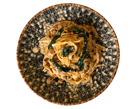 İstiridye mantarı, ıspanak, krema, parmesan, kavrulmuş ceviz.